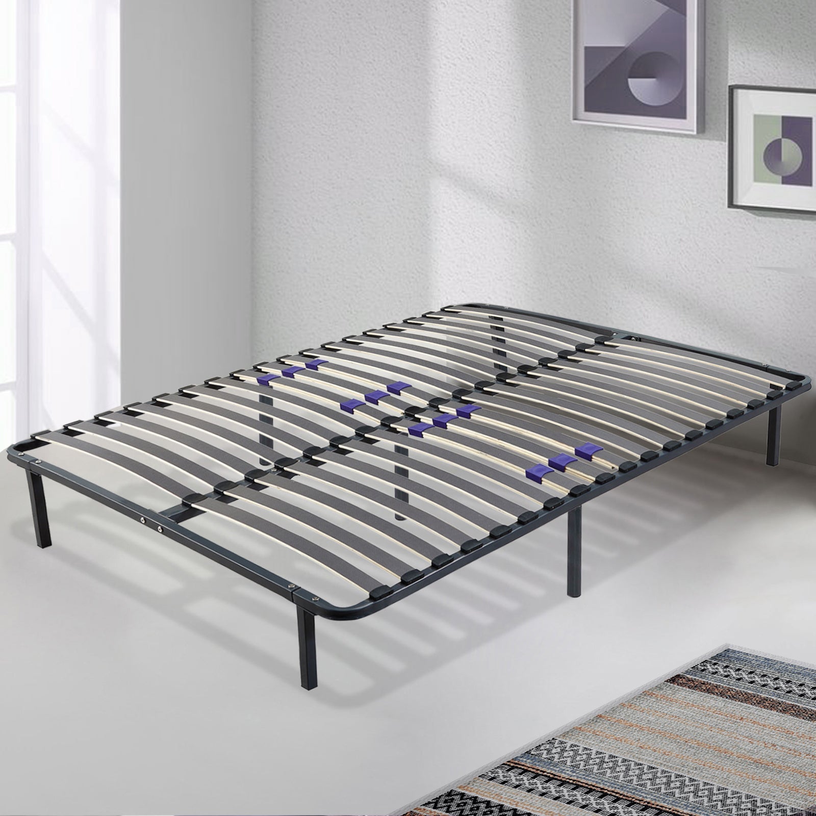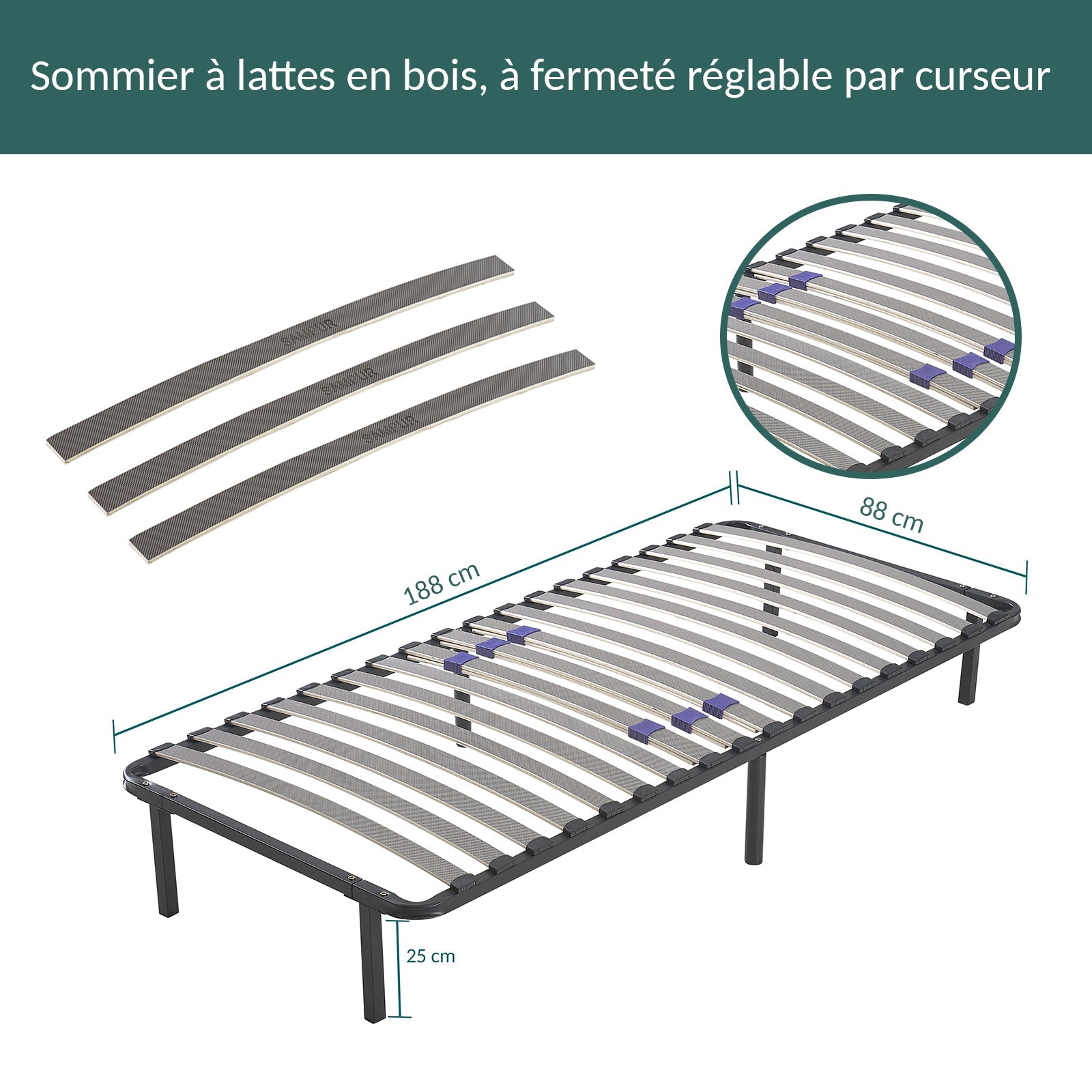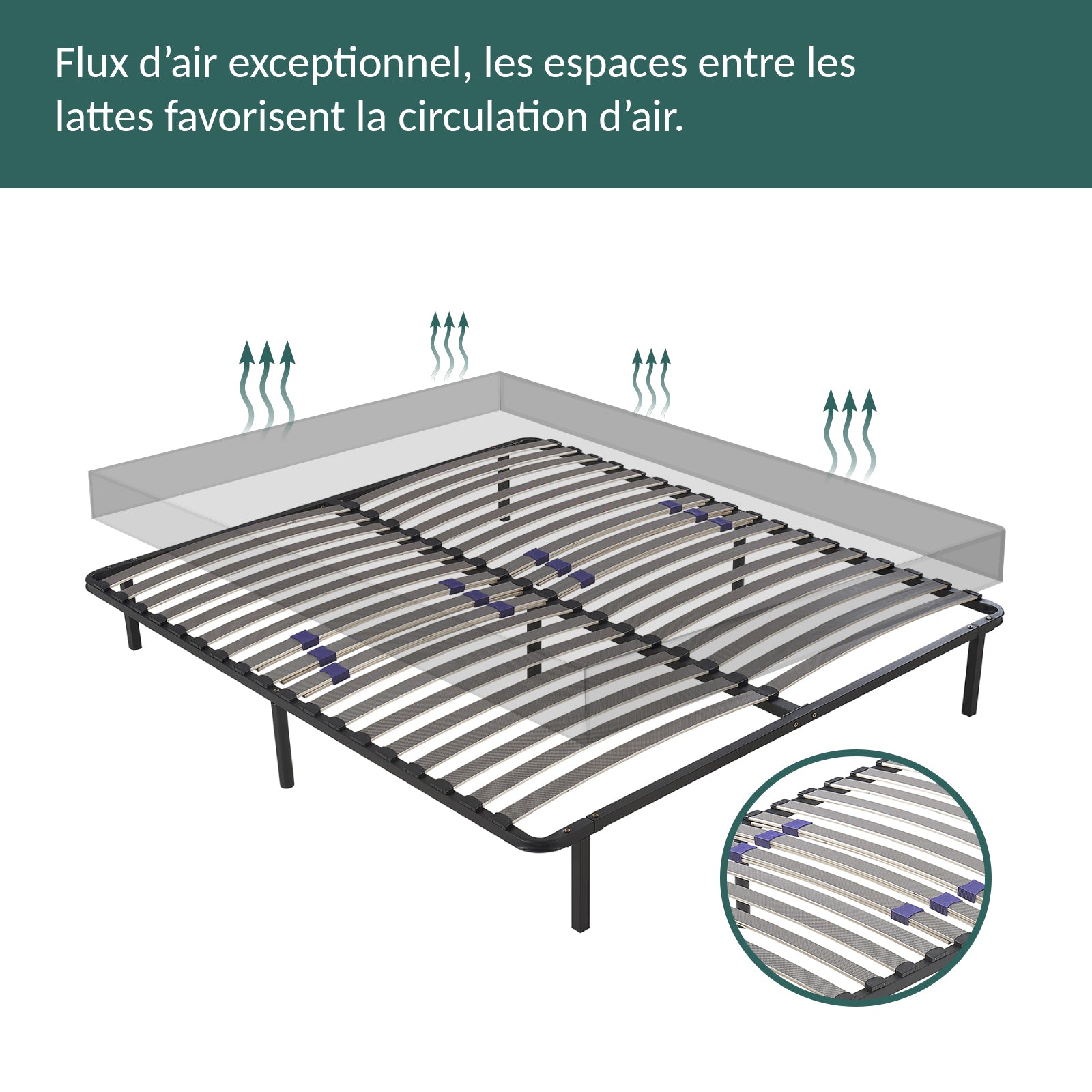 Sa structure robuste en métal laqué époxy, associée à des lattes en bois multiplis de qualité, garantit une durabilité exceptionnelle et une ventilation optimale de votre matelas, pour une hygiène de sommeil renforcée.